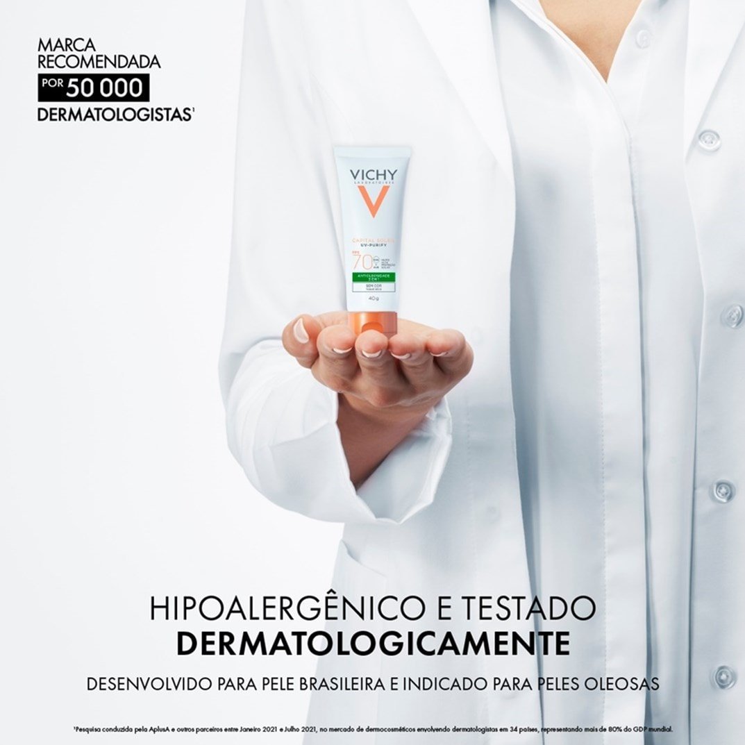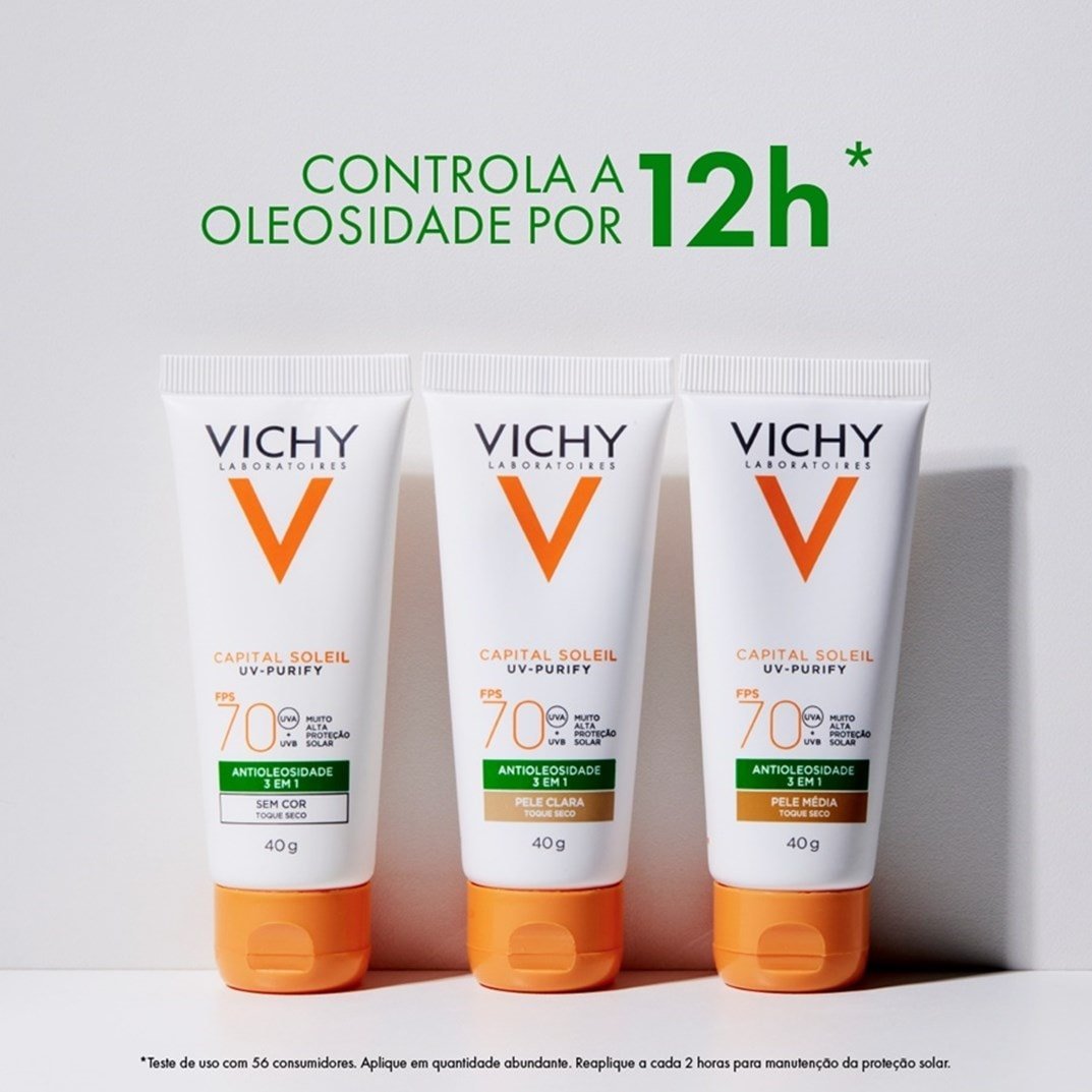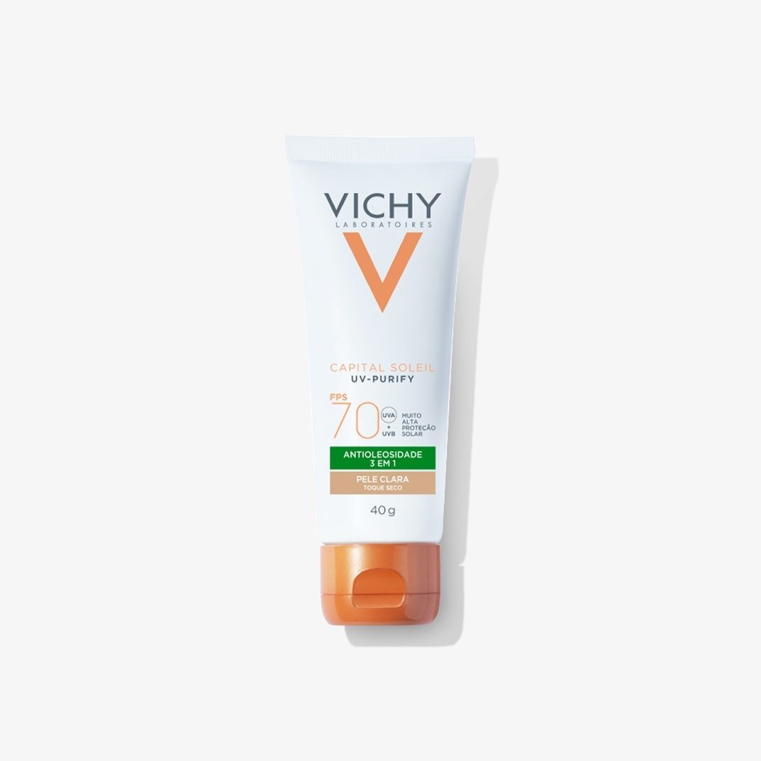 Protetor solar facial sem cor. Vichy Purify FPS 70 é ideal para conferir alta proteção contra os raios UVA e UVB, ao mesmo tempo que controla a oleosidade excessiva.